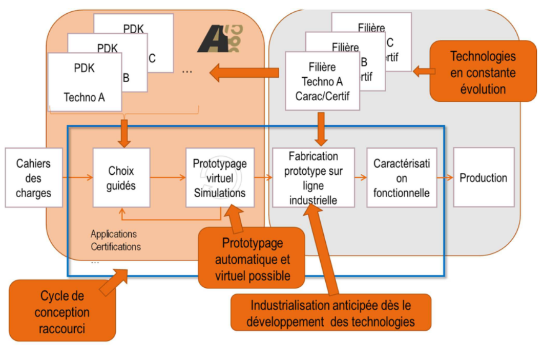 Une filière technologique de puissance intègre et met en œuvre un nombre fini et figé de composants et logiciels via un processus technologique collectif défini, figé et fiabilisé pour répondre aux besoins d’un champ applicatif. Elle est caractérisée par un DRM (Design Rules Manual) et un PDK (Process Design Kit).